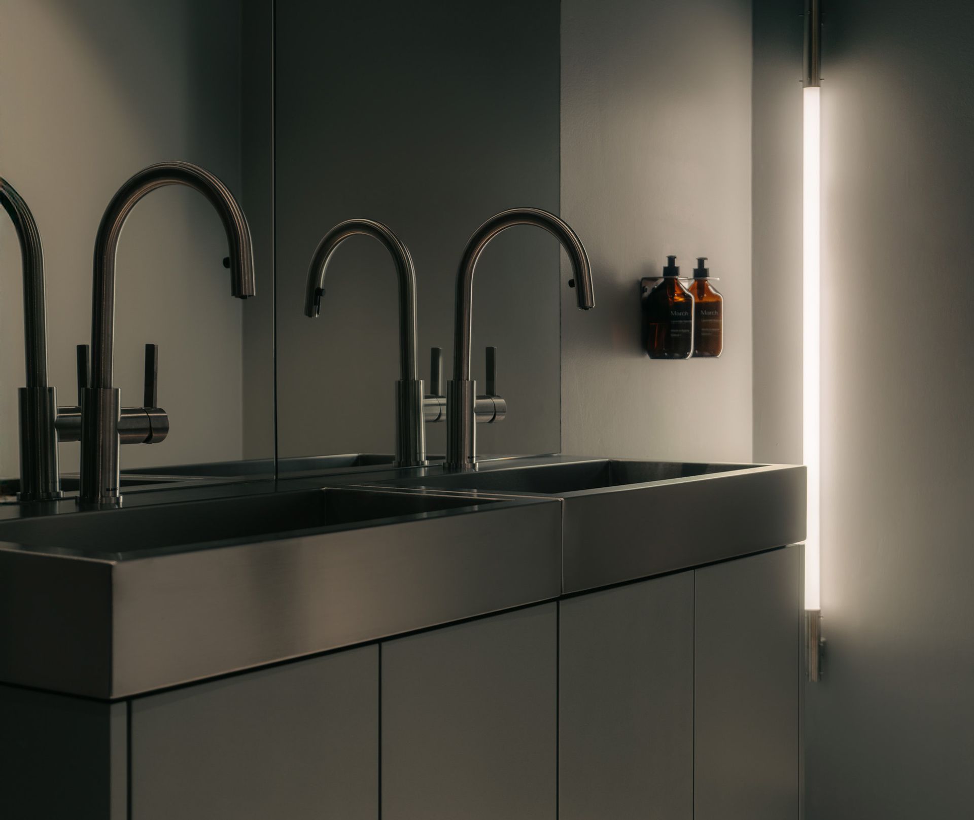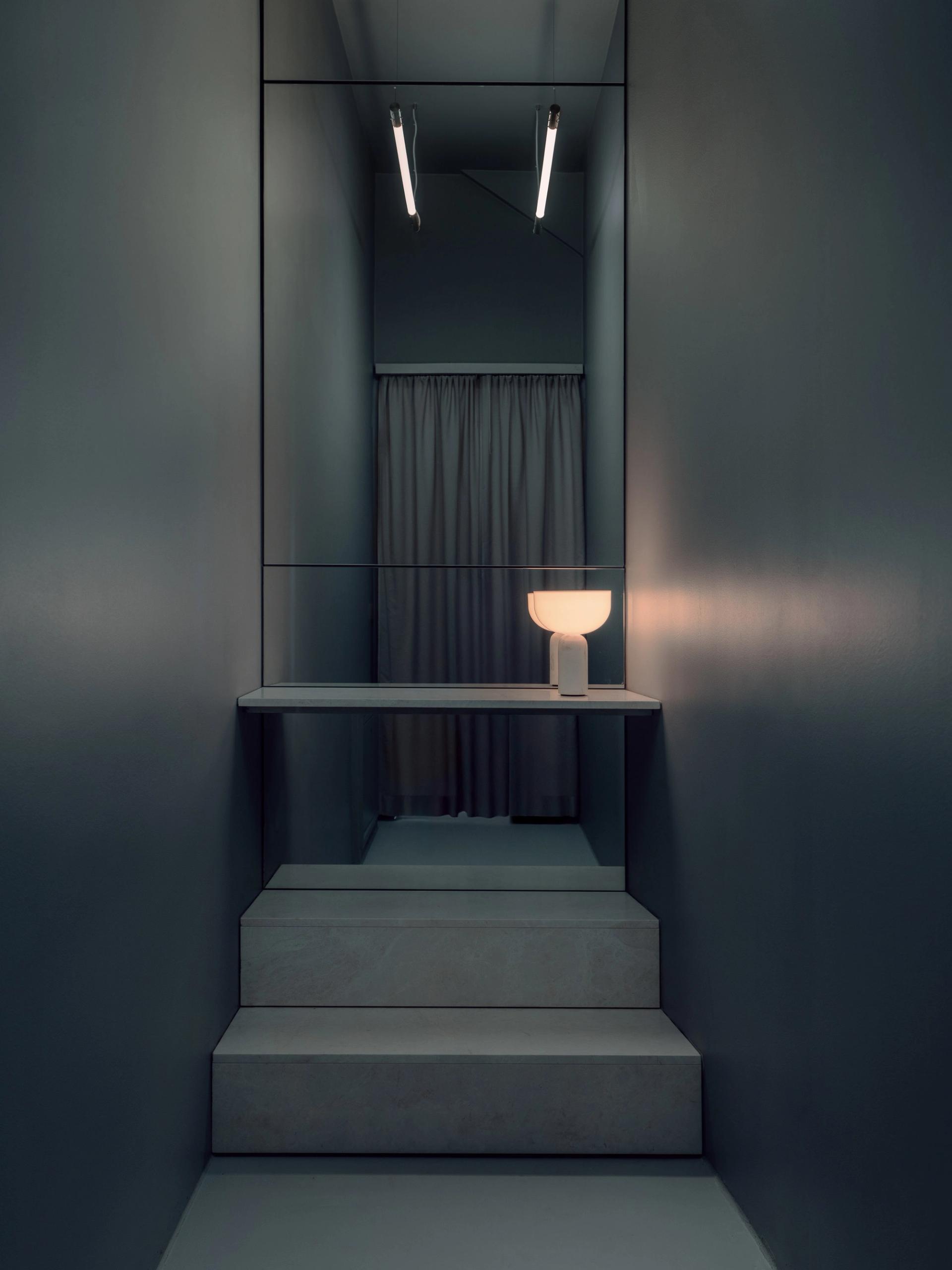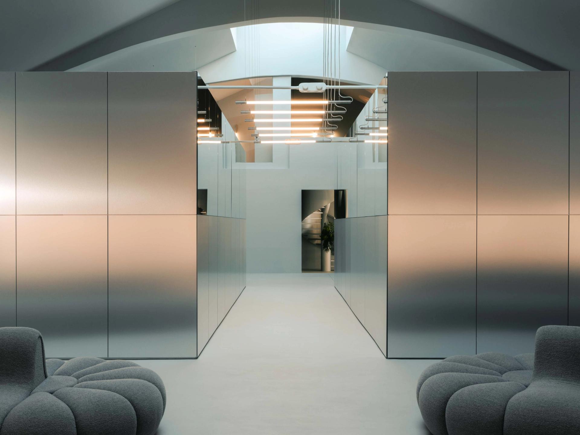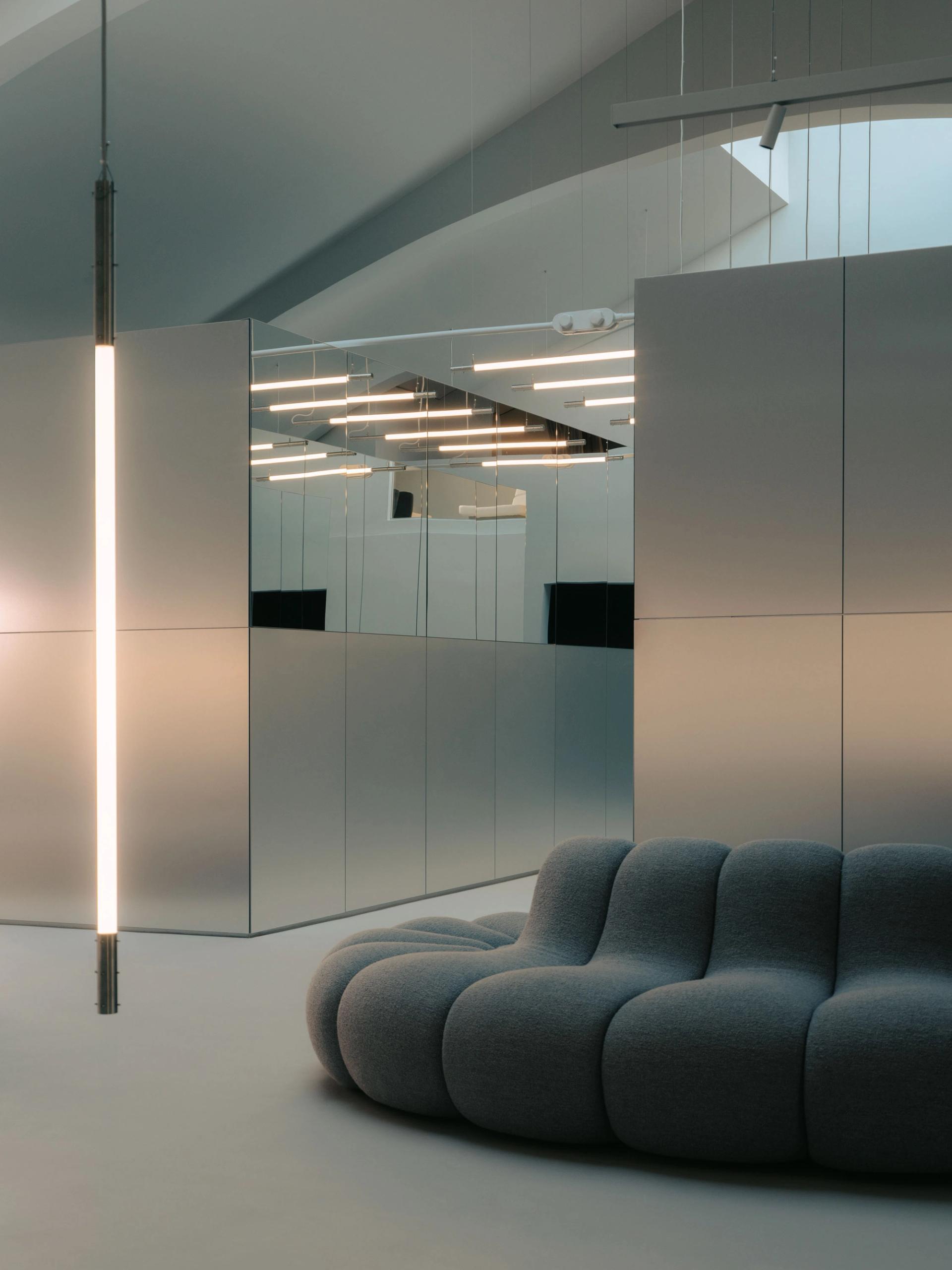 The challenge was to preserve the building's holy identity while crafting a functional, state-of-the-art environment. Key design elements include light gray walls, polished aluminum surfaces, and large mirrors, creating a sense of lightness.