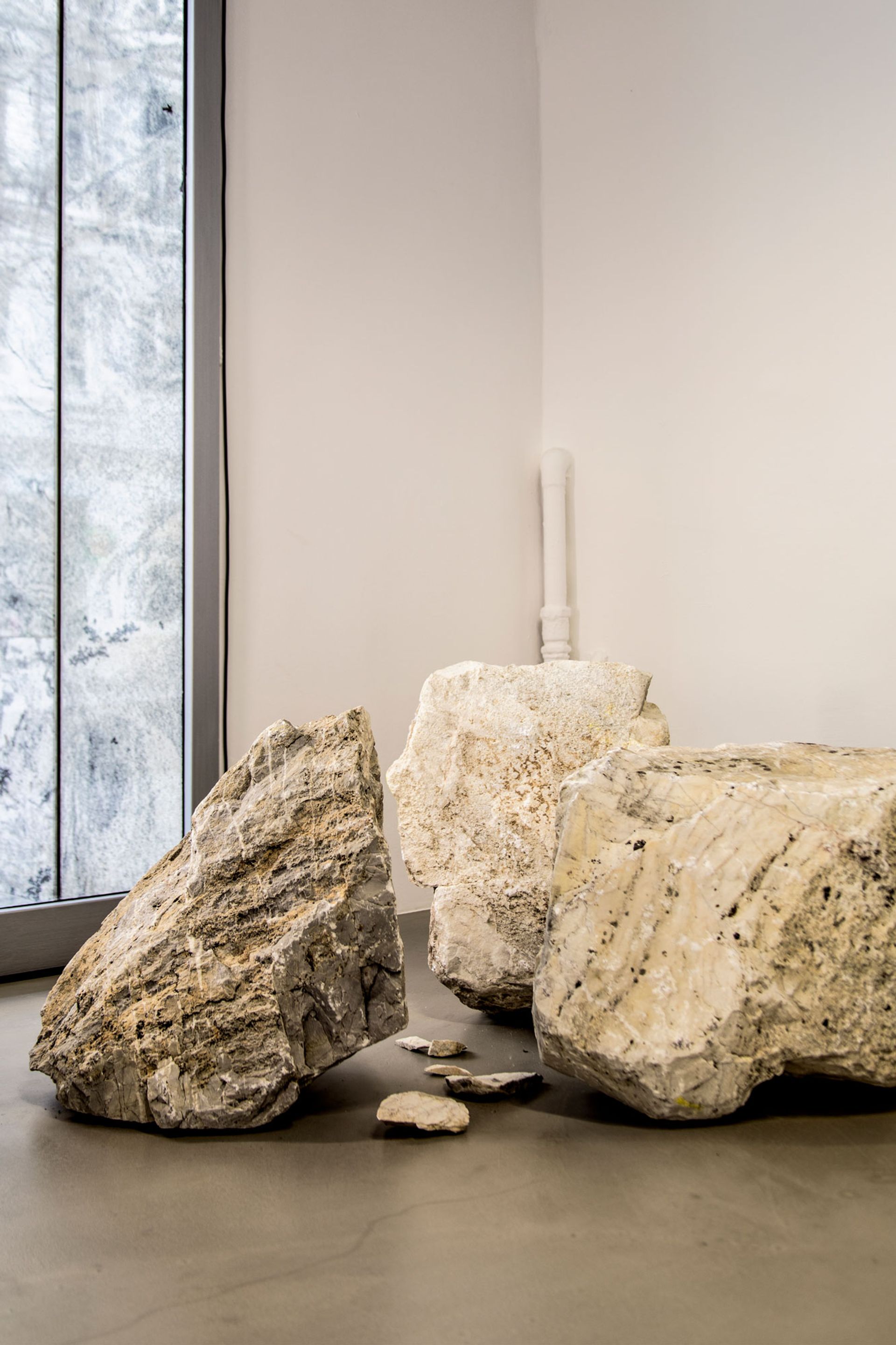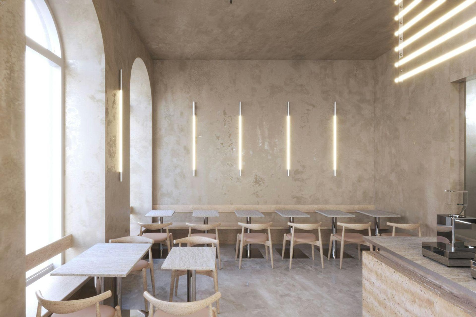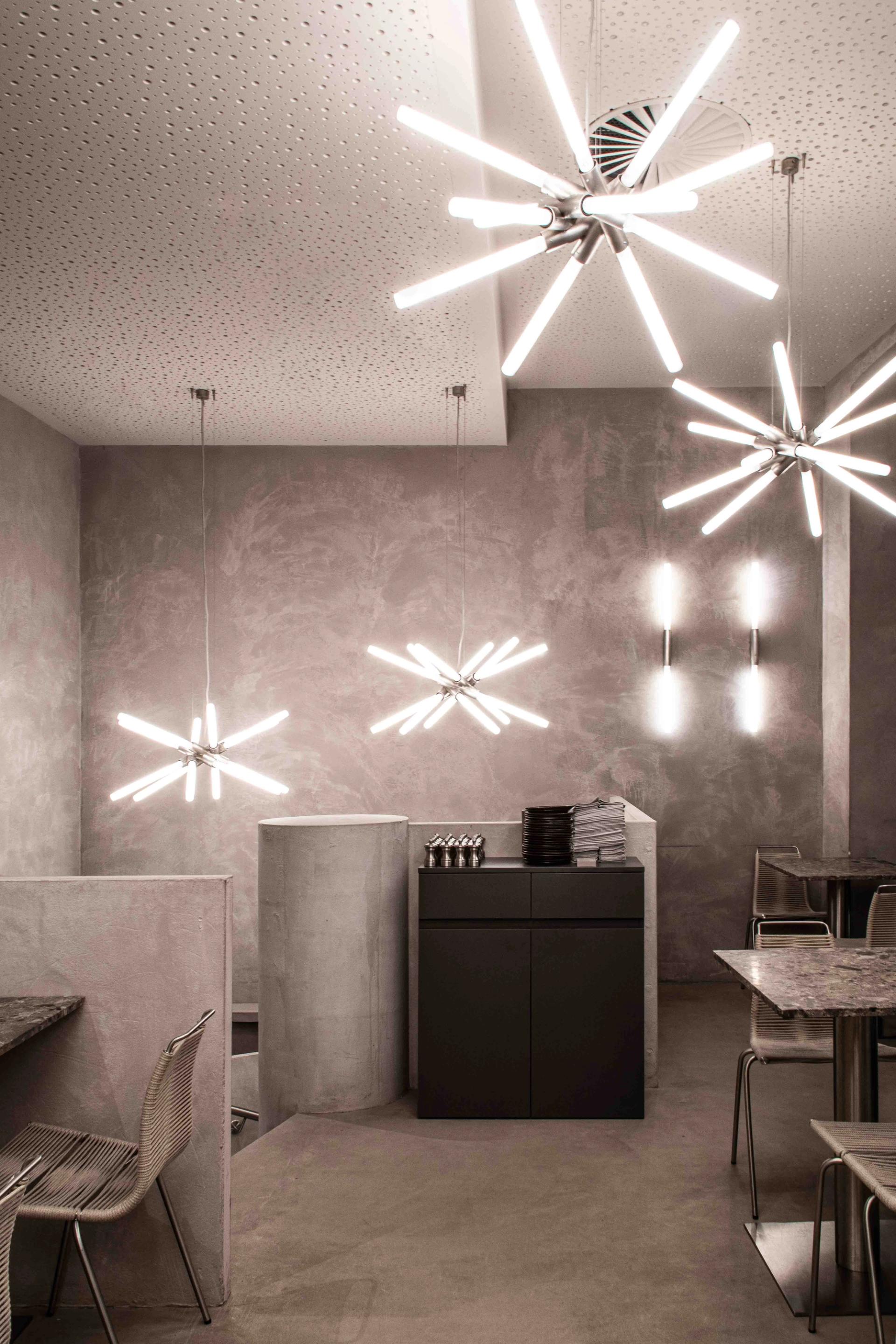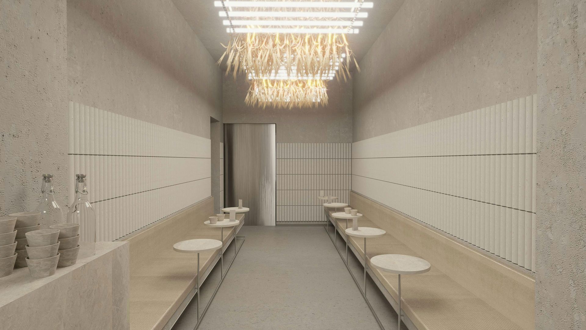 Store 4 plays with the contrast between soil and metal. The centerpiece of the space is the archaic bar made from rammed earth, flanked by light sculptures based on SR’s signature SR-L-01 light.