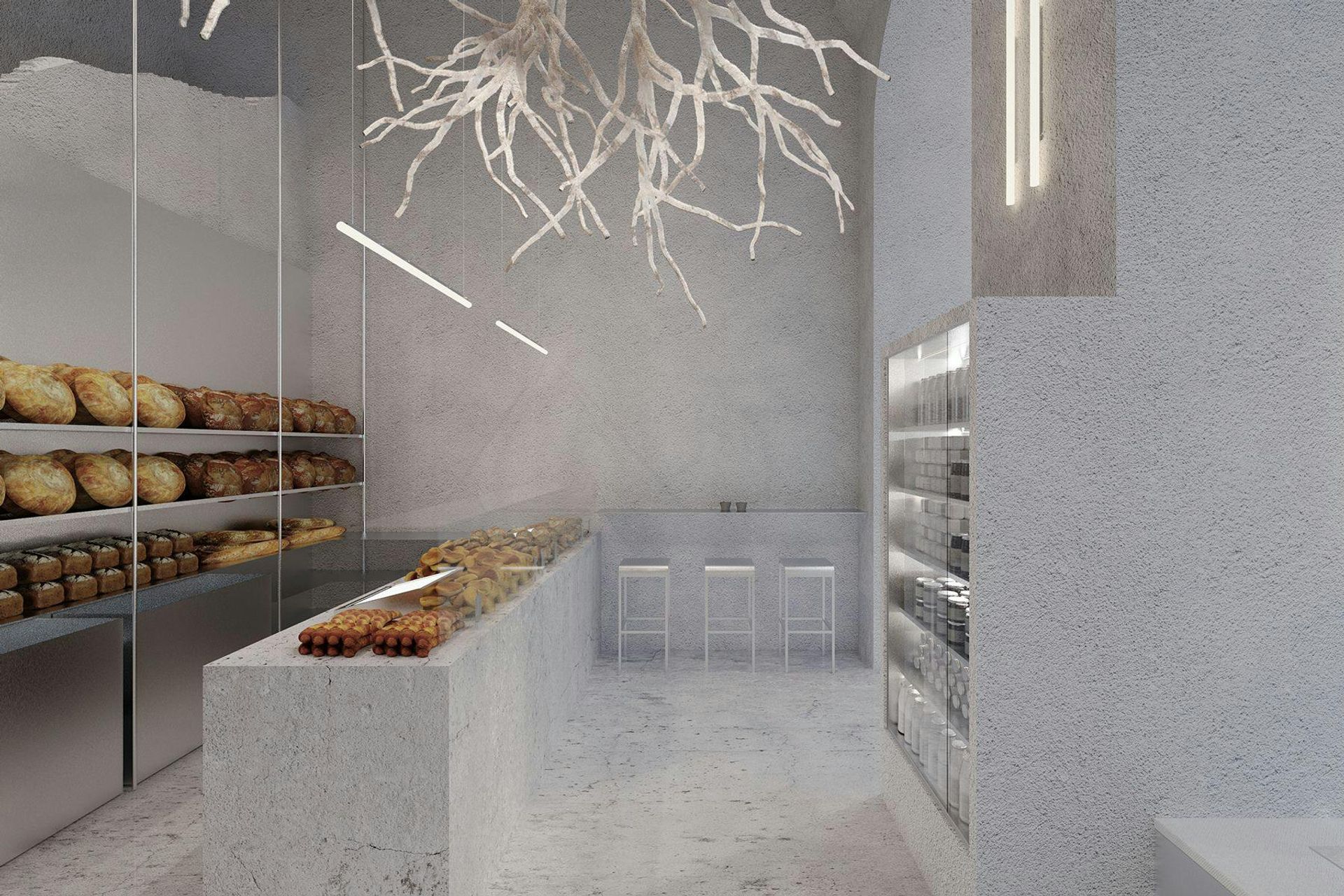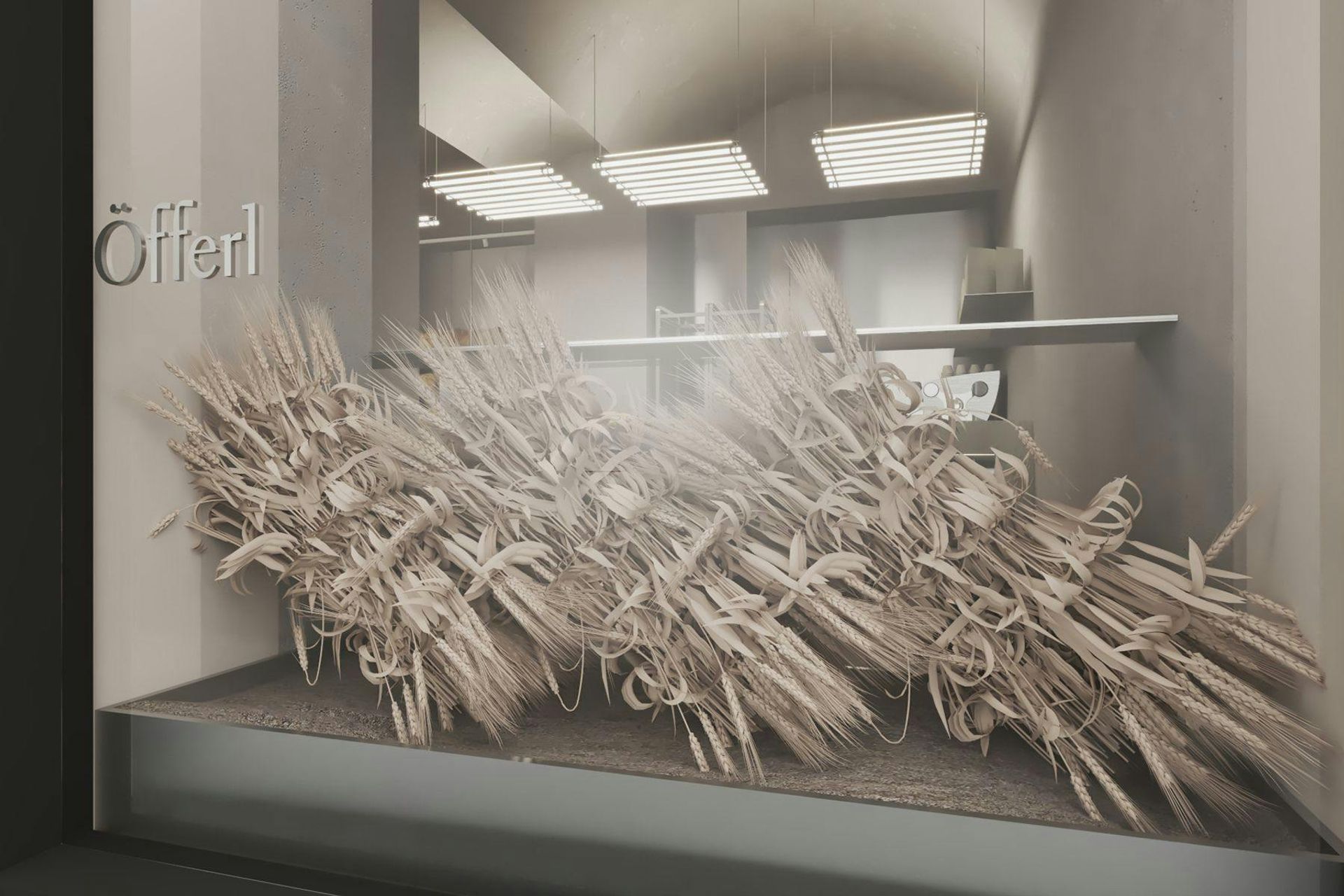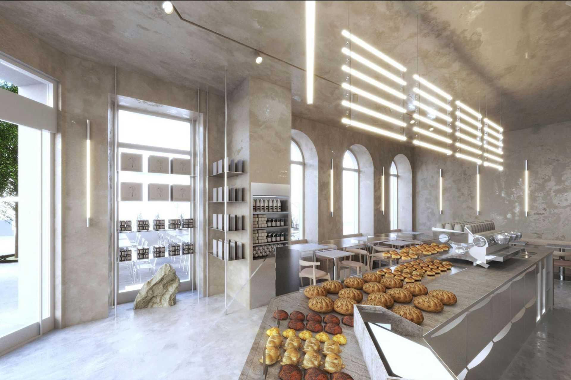 Store 3 plays with the contrast between light and earthy tones and is an homage to the old craft of wheat-binding that is nearly extinct today. The space features a sculptural desk made of natural stone, and distinctive custom lamps. Large windows allow natural light to fill the space, enhancing the connection between the interior and the bustling street outside.